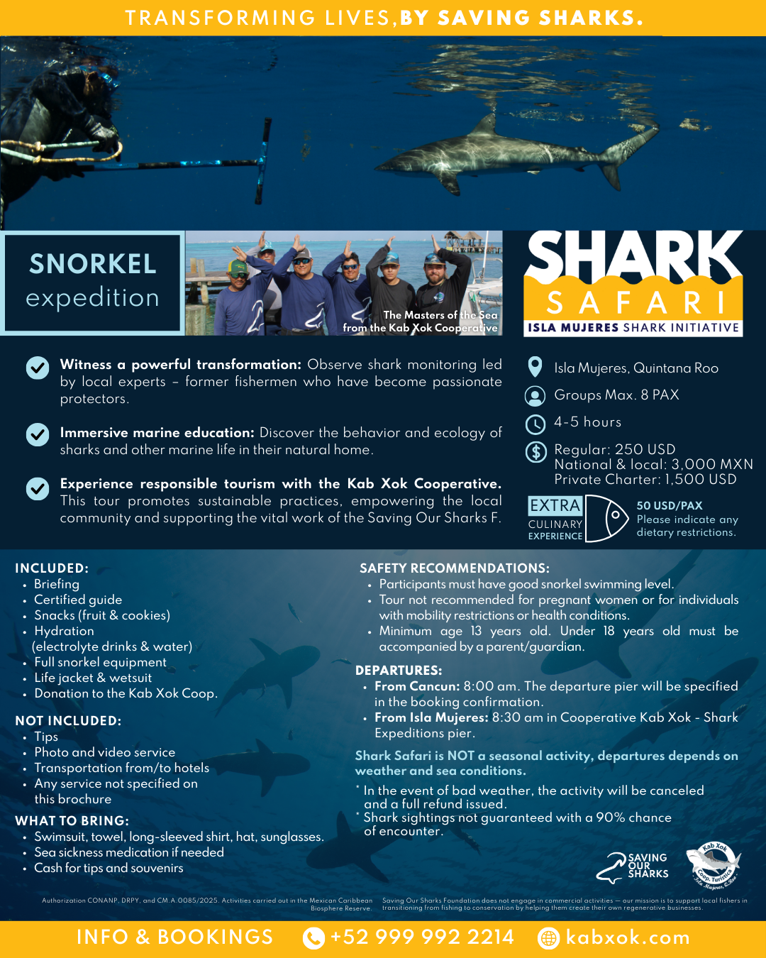 DO NOT book this activity if you are experiencing any current medical conditions that could limit your ability to swim, climb a ladder, support your own weight, or do cardiovascular activity in the open ocean, Your safety is our number one concern. (Examples of such include but are not limited to: heart conditions, vertigo, pregnancy, inability to hold breathe, obesity) For some, the environment experienced can be challenging and exhausting. Please communicate with our crew if you have any concerns from a physician. If you have any questions, please contact us at cooperativakabxok@gmail.com